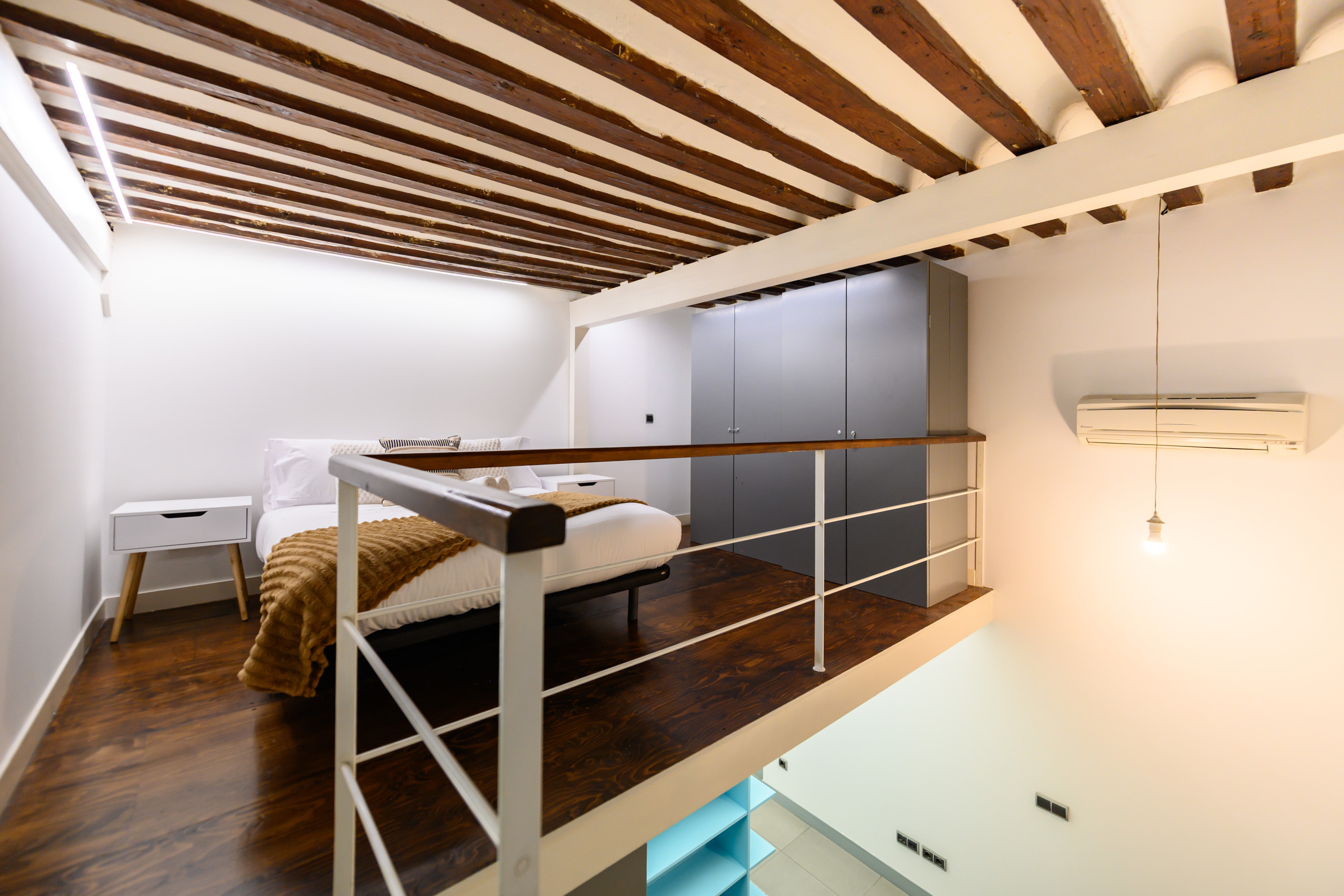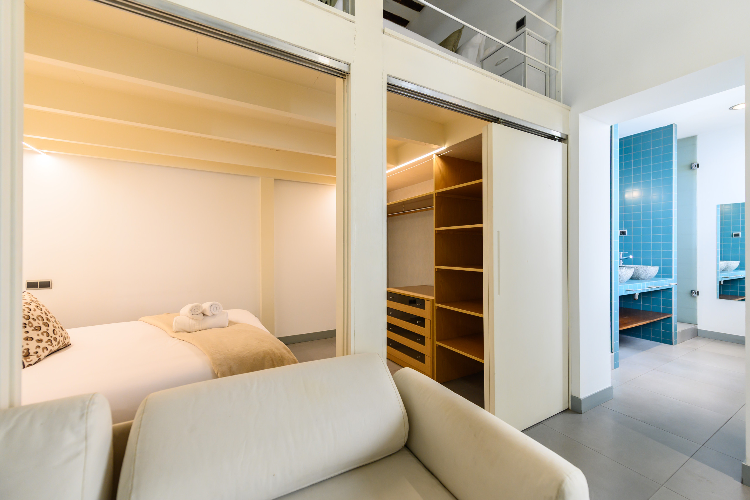 • An upper loft-style floor with two double beds, a large wardrobe, and plenty of storage space.