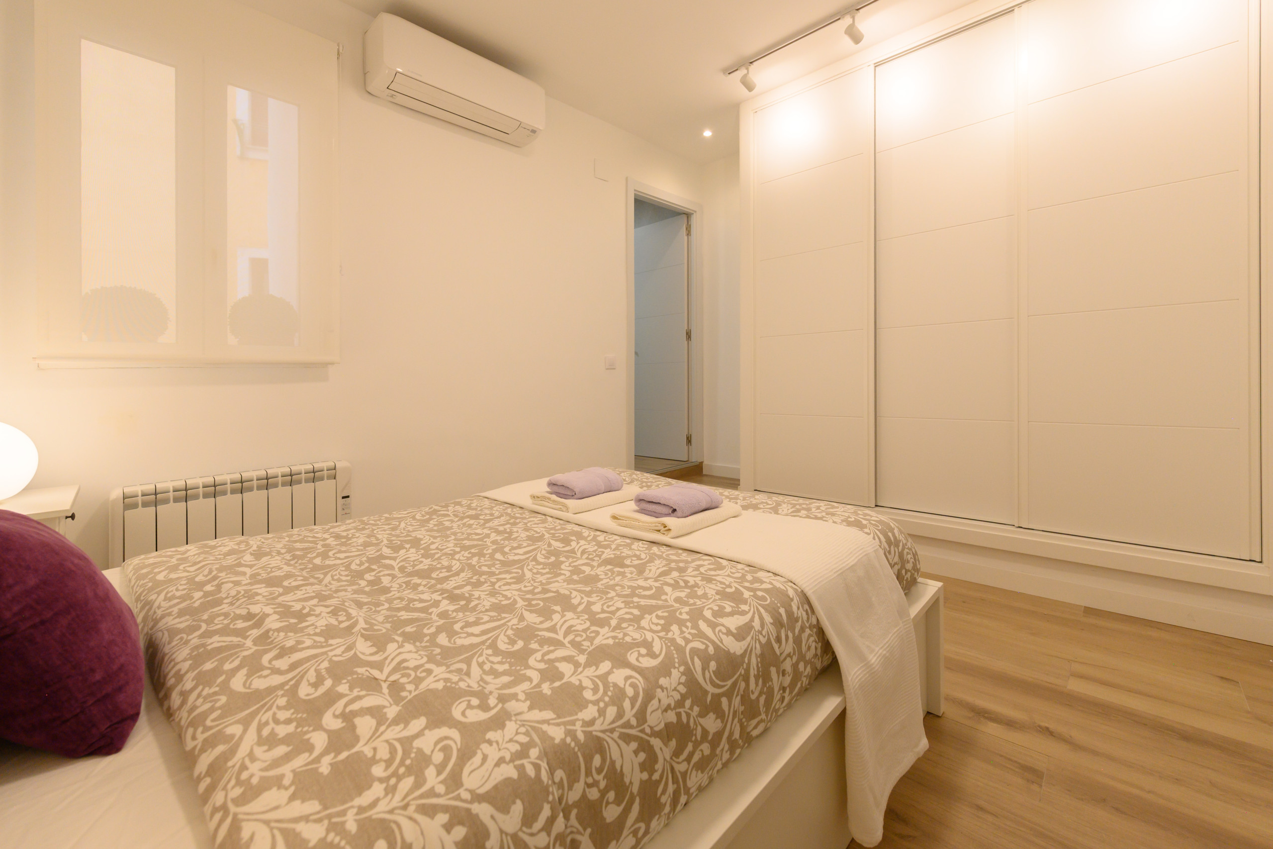 The main bedroom is furnished with a comfortable double bed and a spacious built-in wardrobe, offering excellent storage space for clothes and personal items, ideal for maintaining order and making the most of the space.