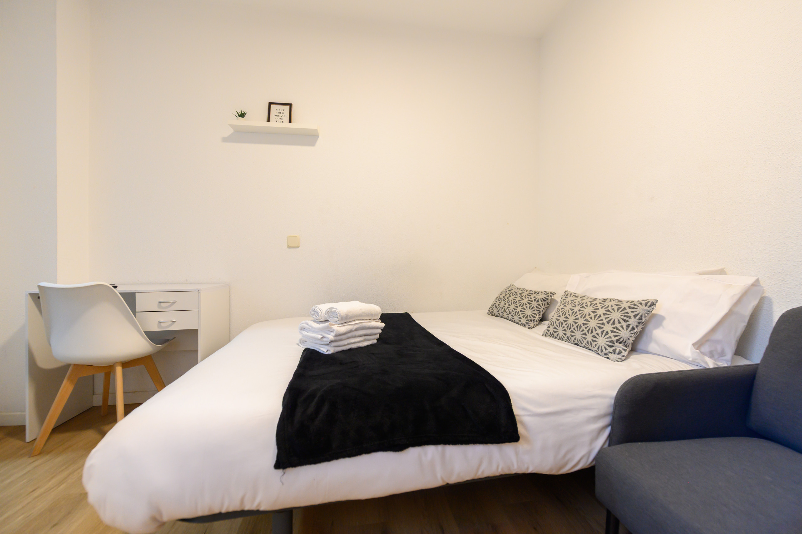 • A bedroom with a double bed, flat-screen TV, built-in wardrobe, desk, and sofa, perfect for both relaxing and working.