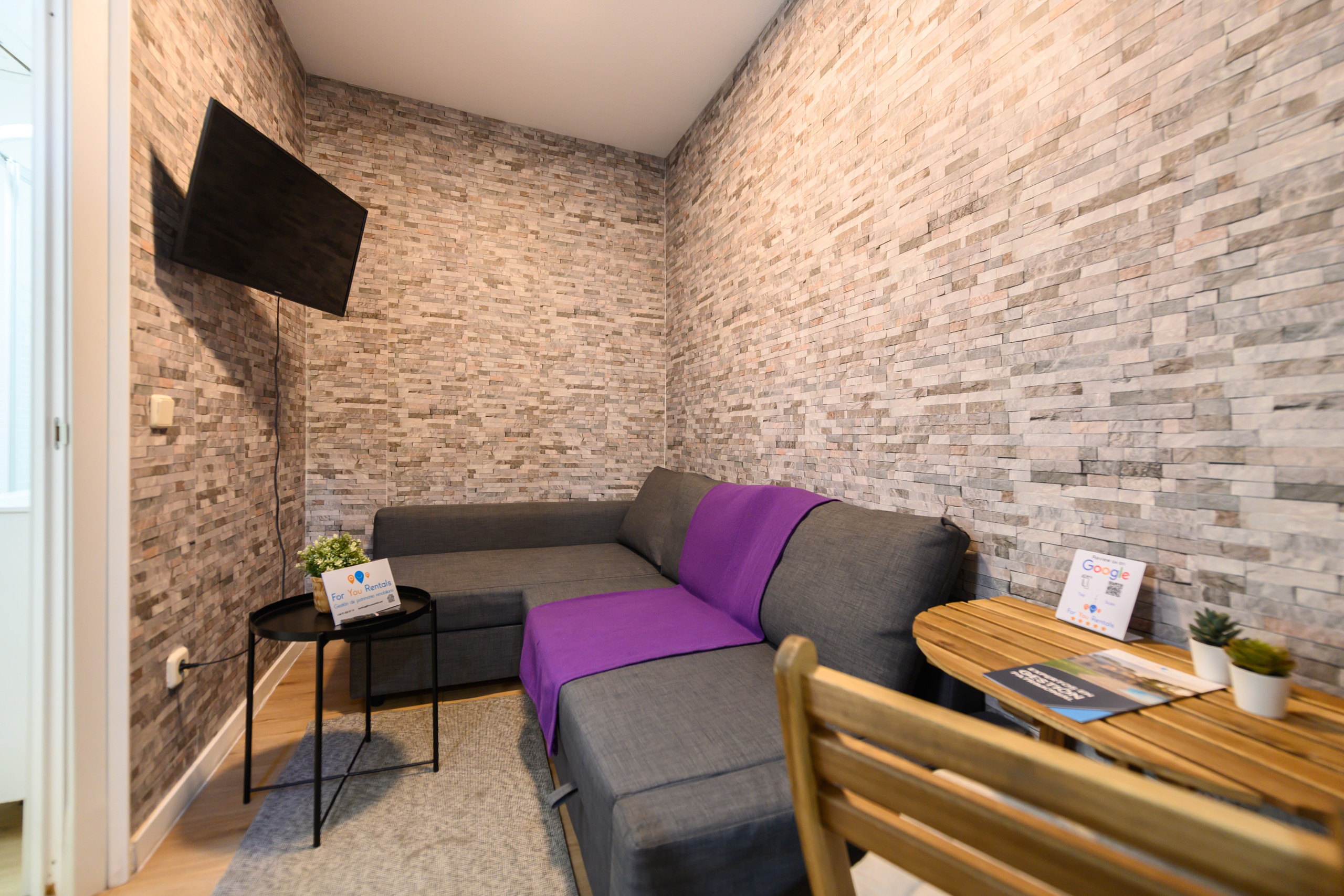 • A common area with a sofa that converts into a double sofa bed, a table, and a television—a comfortable and practical space.