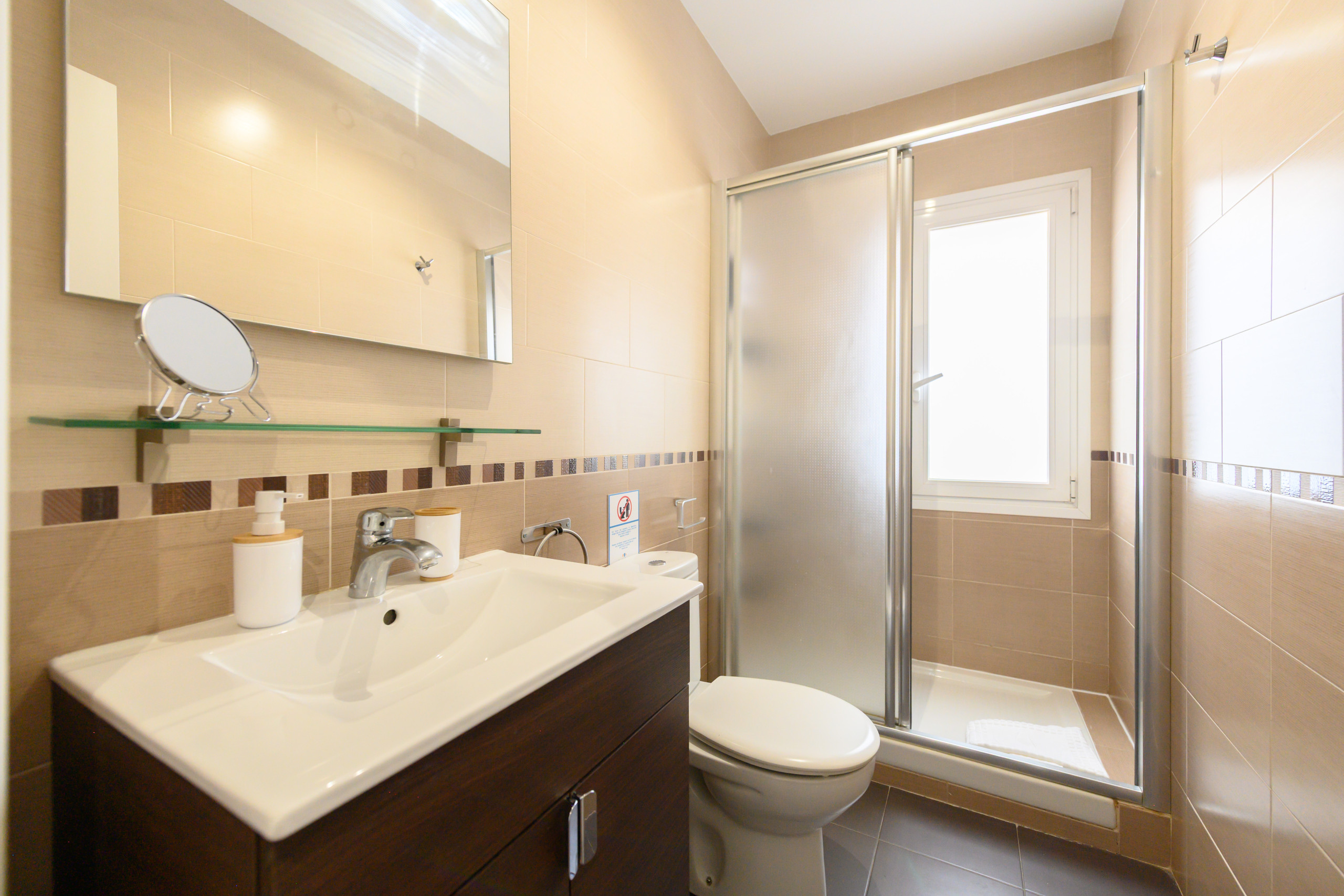 The bathroom features a modern shower tray and all the necessary elements for day-to-day life, with a current and functional design.
