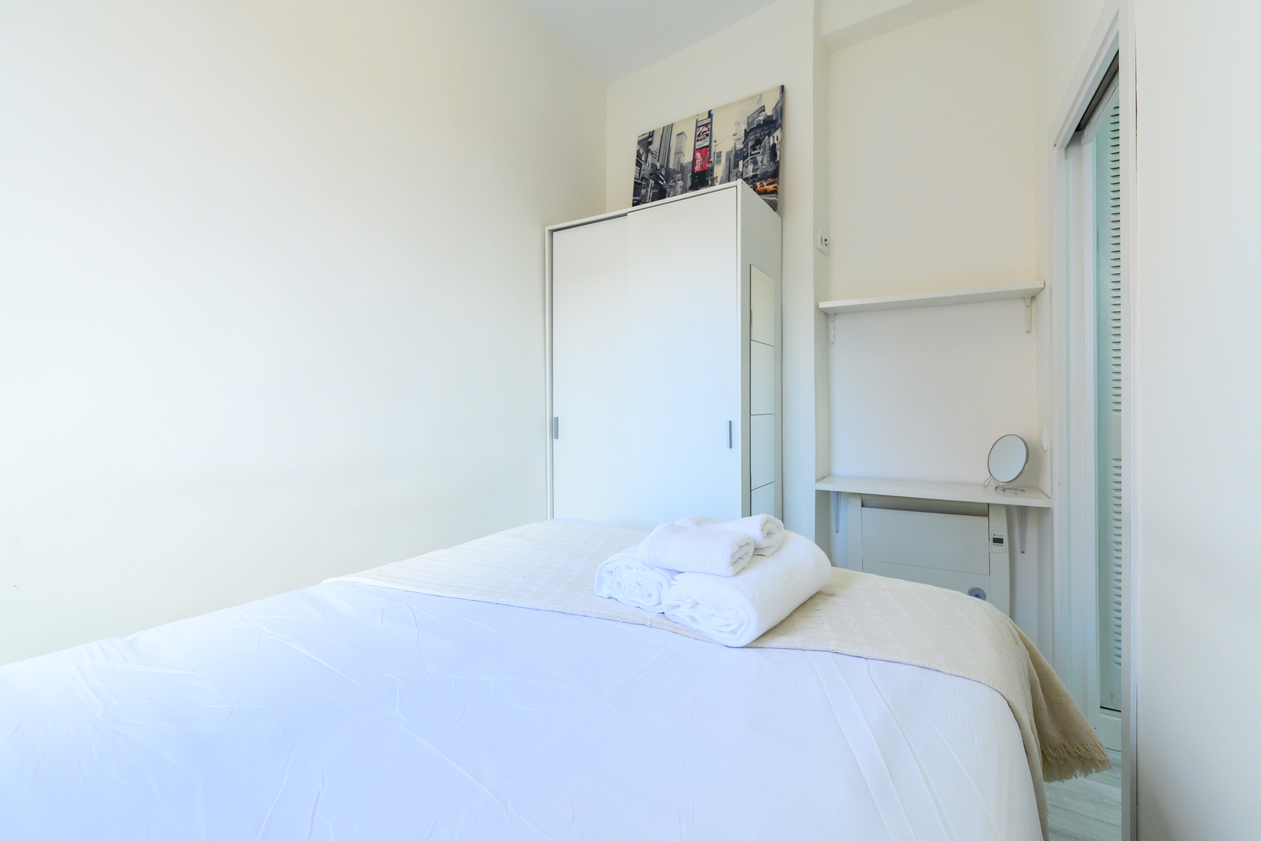 • Bedroom: Double bed, window, air conditioning, mirror, and wardrobe.