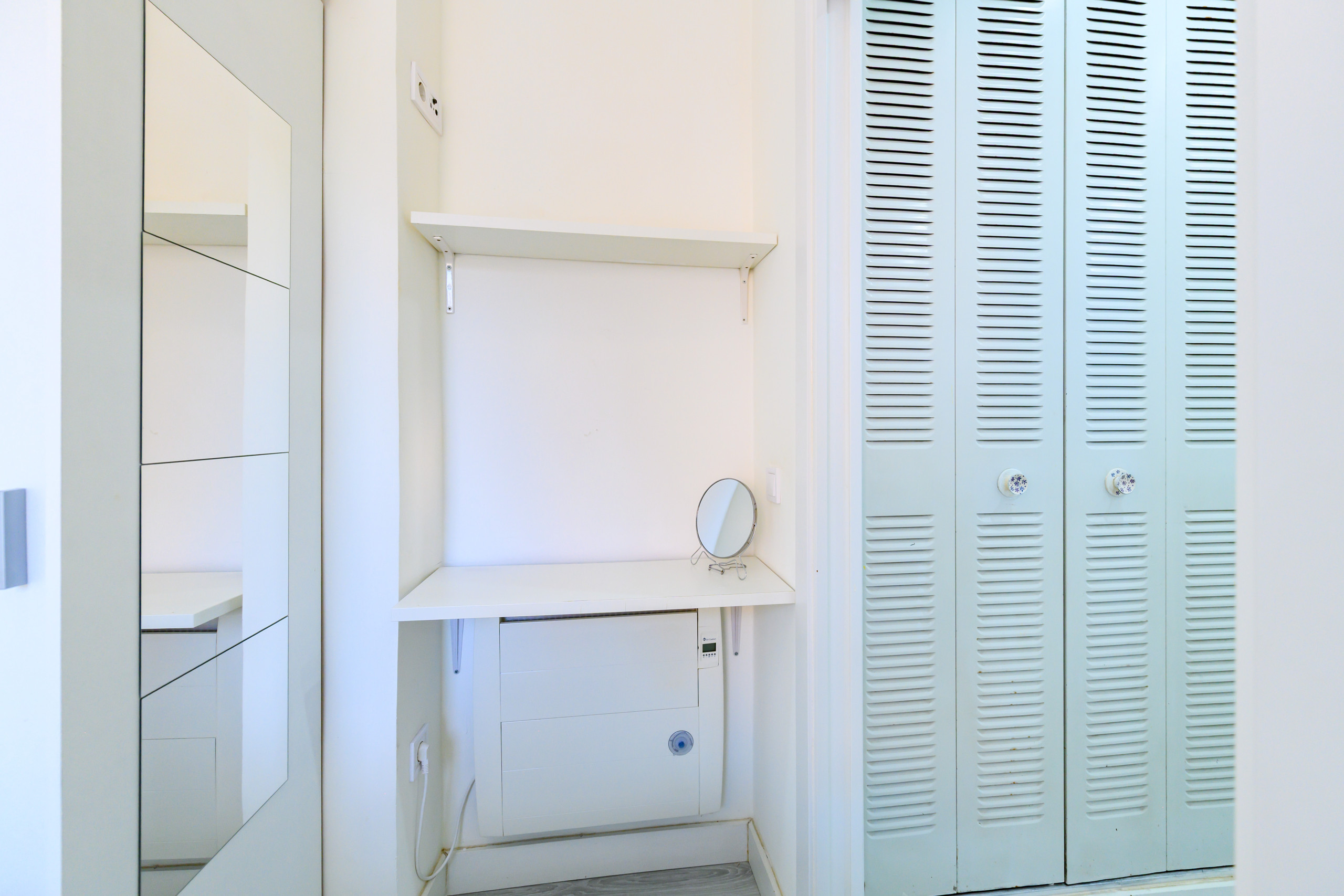 • Bathroom: Toilet, shower, mirror, washing machine, and storage space.