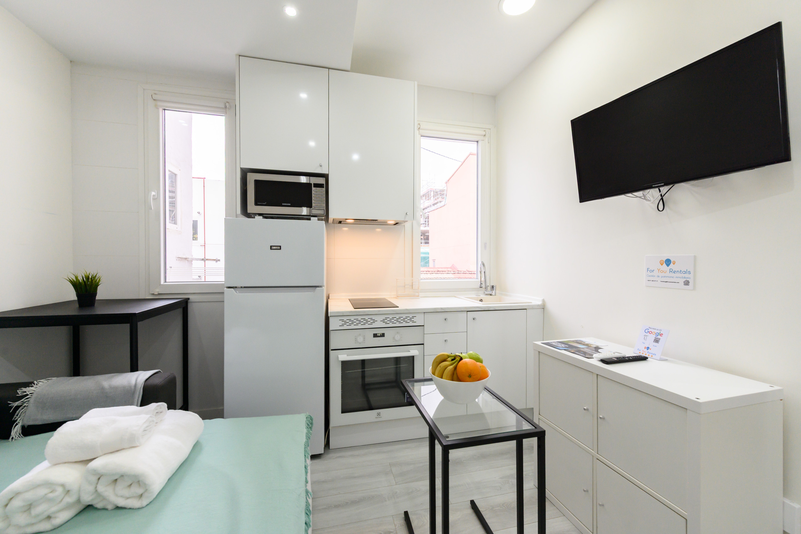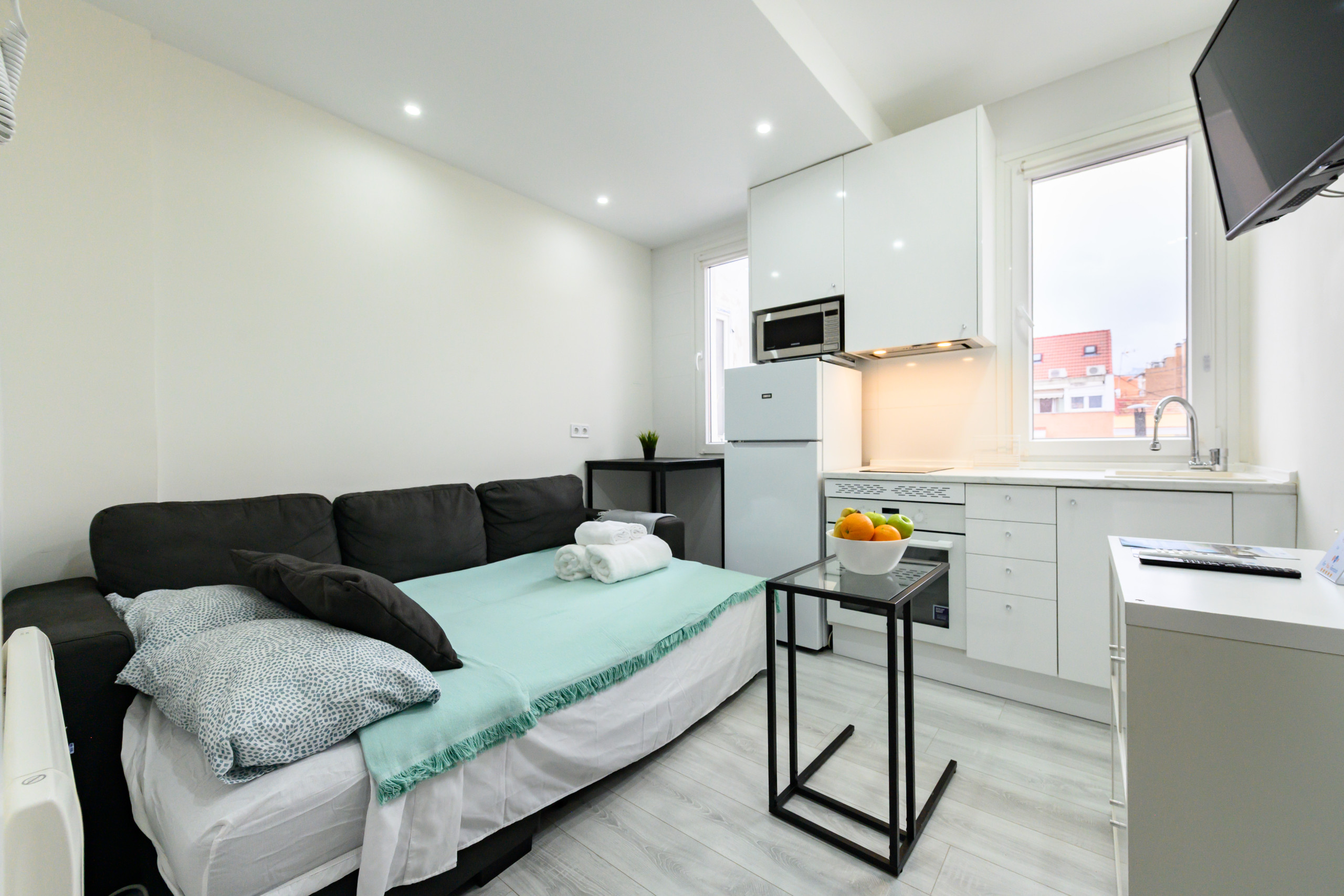 • Living area: Common area with a sofa bed, table, chest of drawers, television, built-in wardrobe, and good natural light.