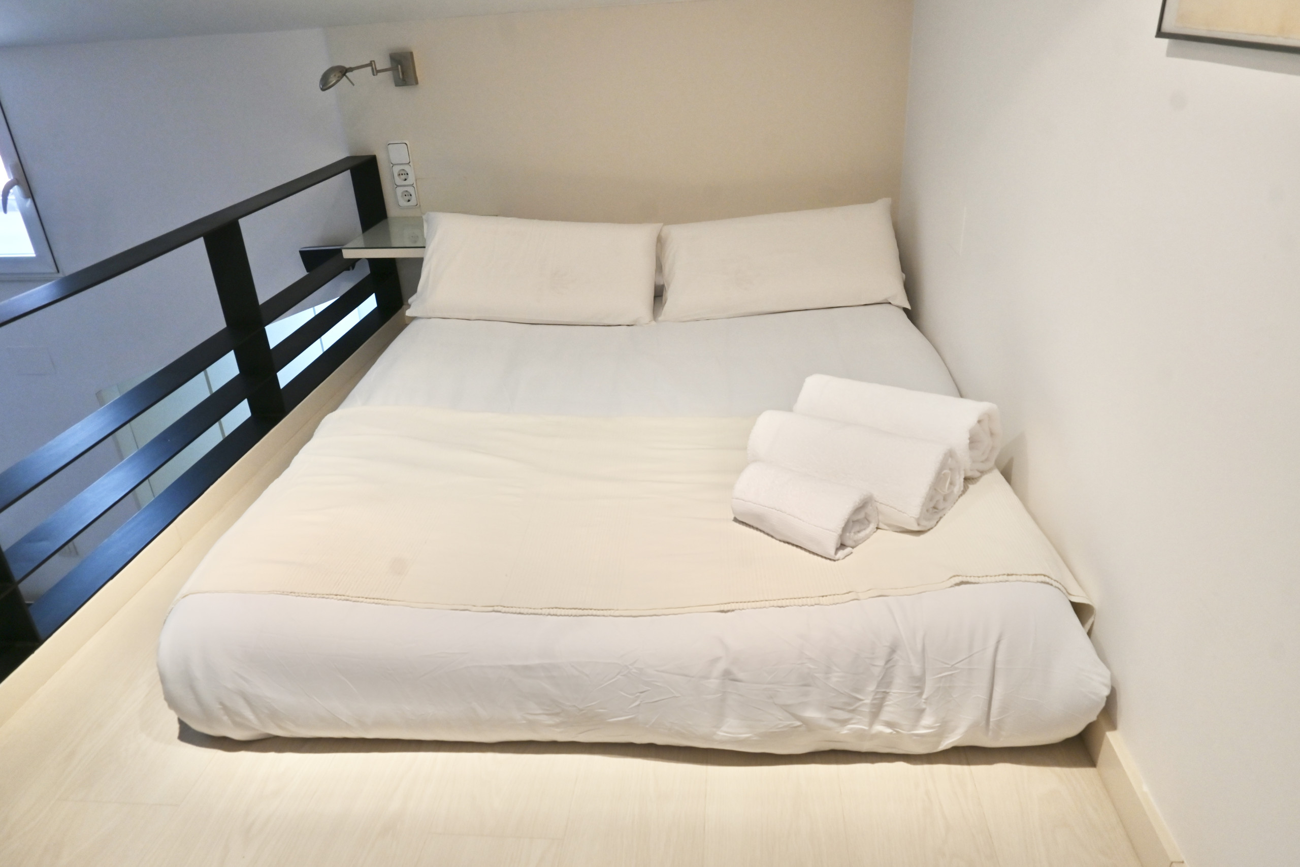 Mezzanine Bedroom: The bedroom is located in a cosy mezzanine, which provides a unique and contemporary touch to the space. The double bed is placed on a tatami, creating a welcoming and elegant atmosphere. The layout on the mezzanine not only maximises space but also gives the resting area a sense of privacy.