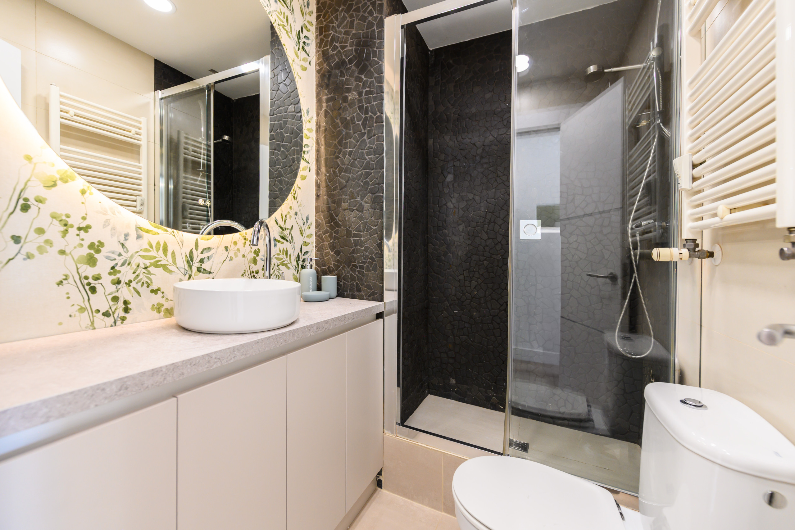 The bathroom includes a shower tray, mirror, modern and functional wash basin furniture.