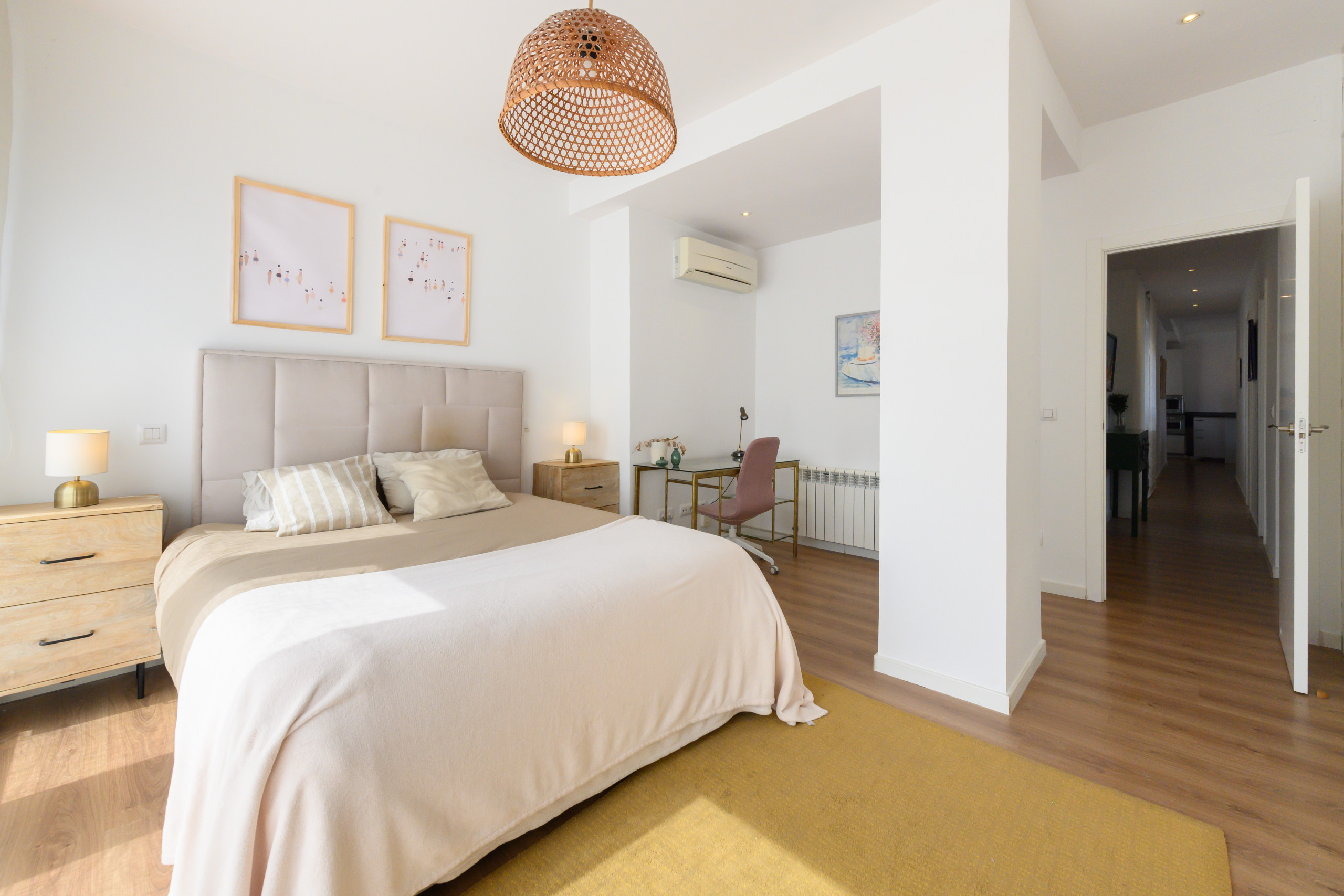 Two spacious bedrooms, both equipped with double beds and fitted wardrobes. One of them includes a desk, ideal for working or studying in comfort.