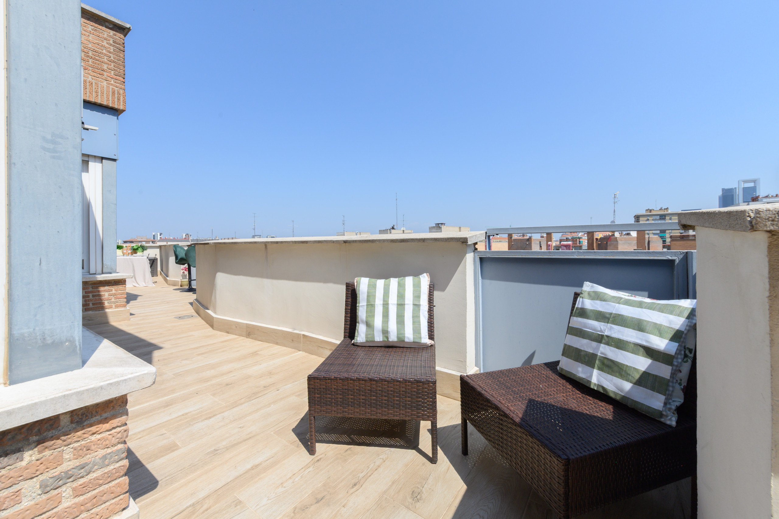 A large private terrace, equipped with a seating area and outdoor dining space, perfect for enjoying the outdoors in a quiet and pleasant atmosphere.