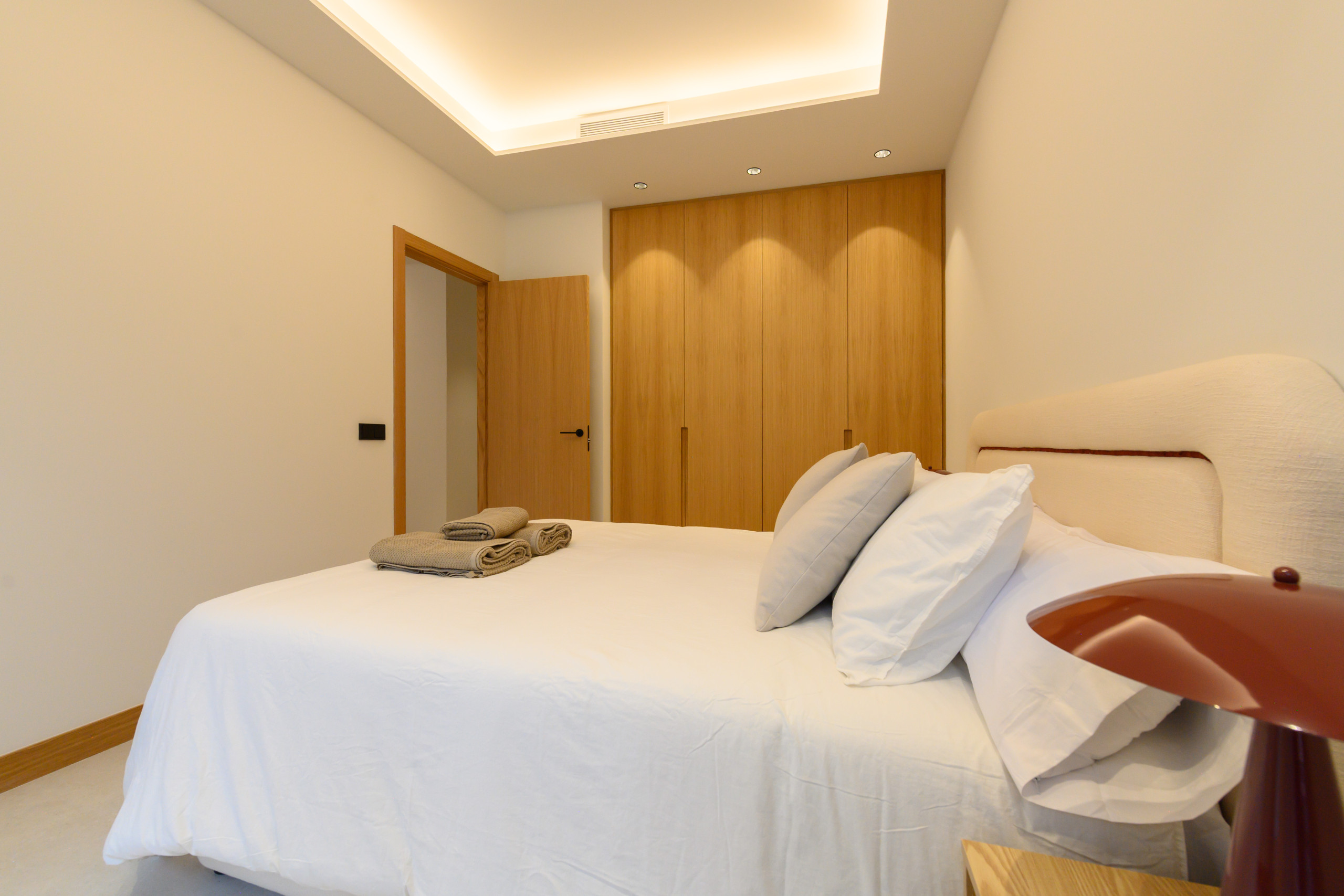 • Main bedroom with double bed, two bedside tables and a large built-in wardrobe.
