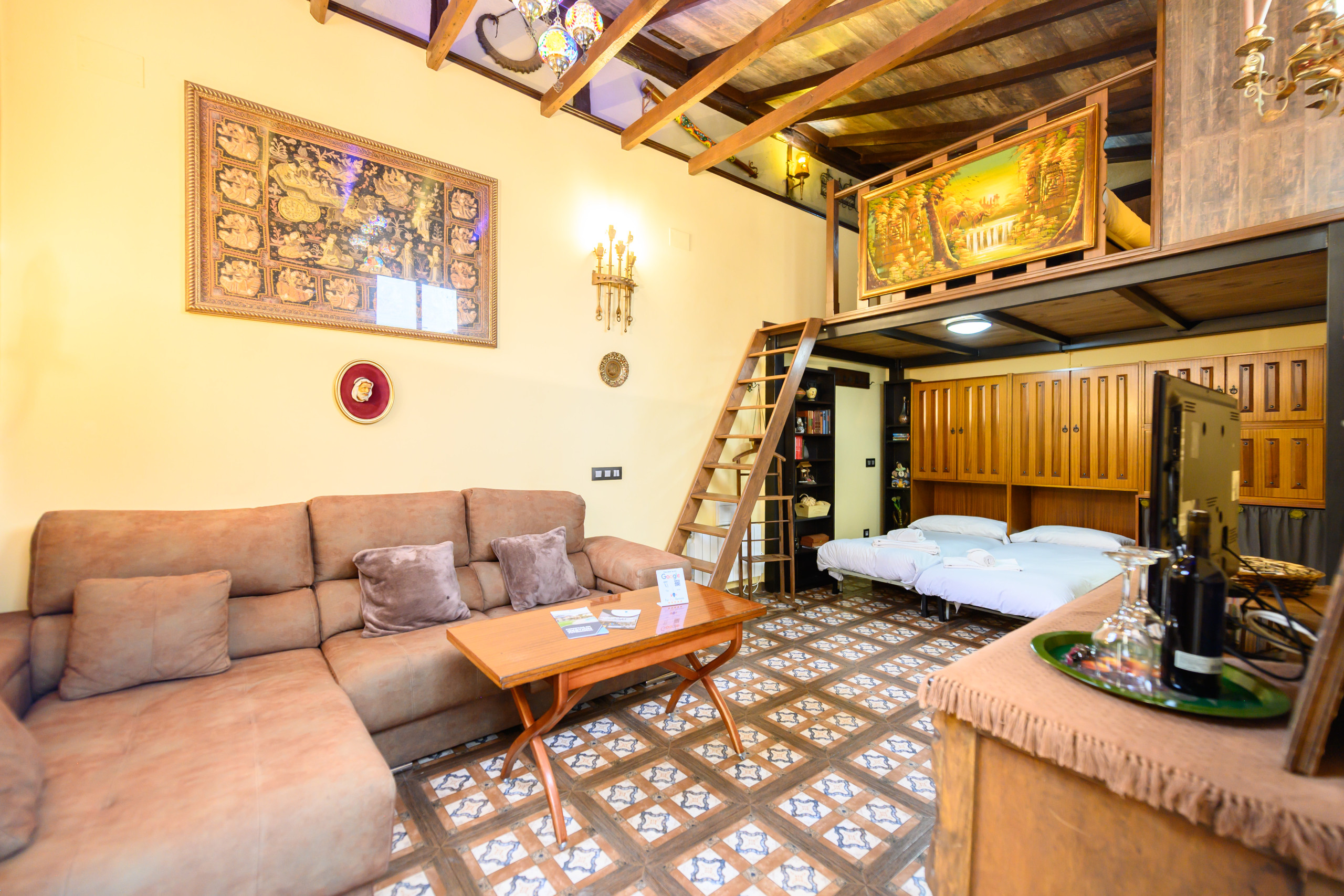The apartment includes: Two single beds, a sofa, a dresser, a TV, a table, a wardrobe, and a washing machine. Upstairs, there is a double bed and a clothes rack. It is an exterior unit with large windows that provide abundant natural light throughout the day. It features a private terrace, air conditioning, and heating. The fully equipped kitchen includes an oven, microwave, refrigerator, and kitchenware. The bathroom has a toilet, shower, mirror, and storage space.