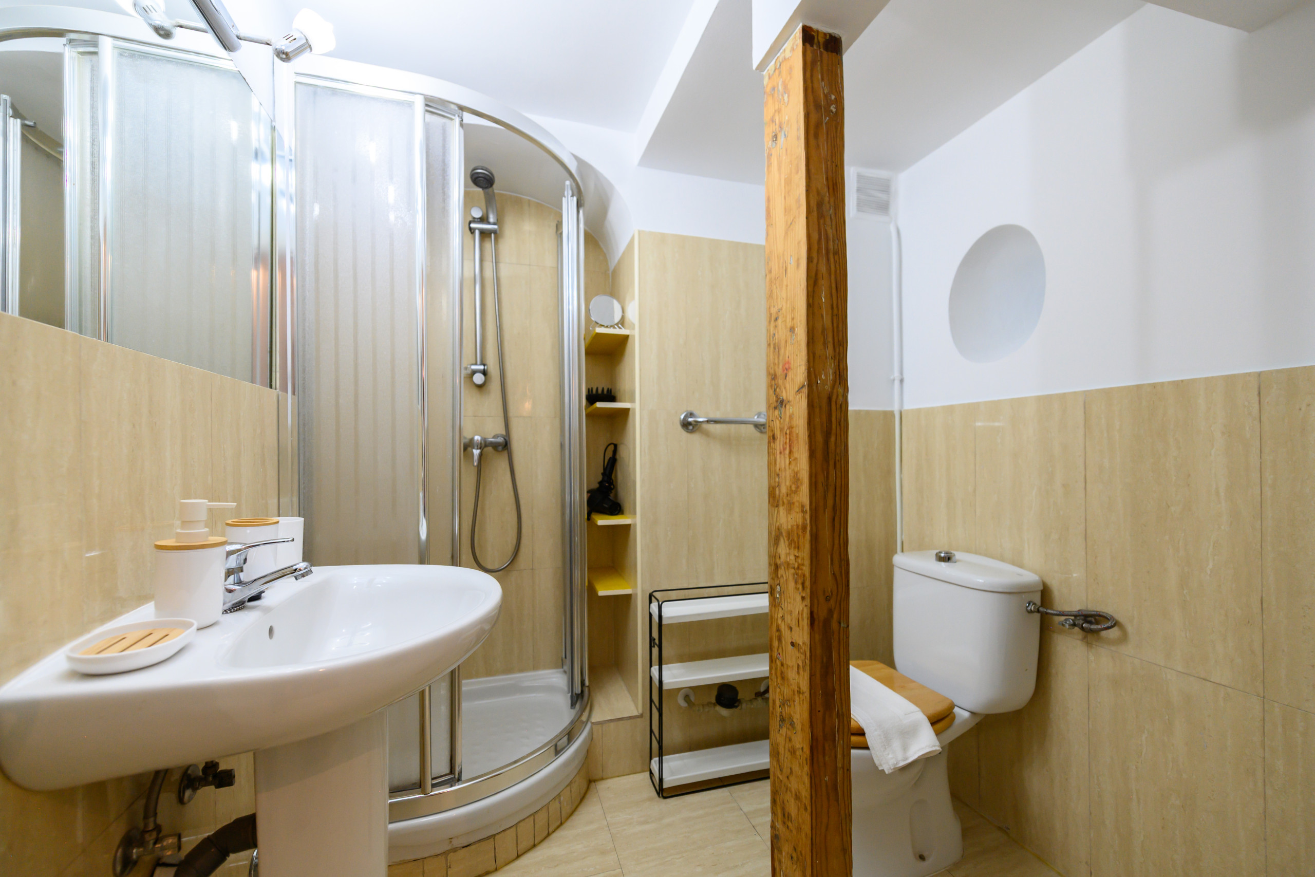 - A full bathroom with toilet, shower, mirror, and storage space. Plus an additional toilet.