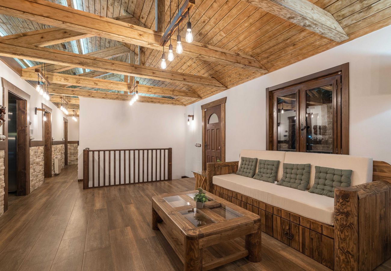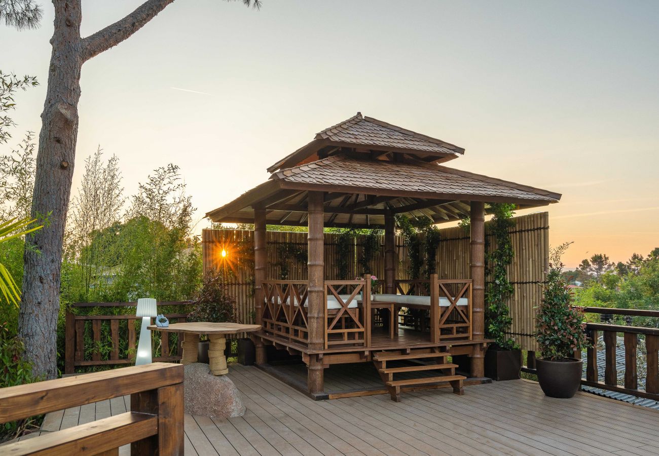 The outside is very versatile, striking and exotic. On one side, on the banks of a heated swimming pool with 3 waterfalls, shower and jacuzzi, there is a porch with hammock area and margarita bar with bamboo finishes. Also, in the lower exterior part of the property, you will be able to enjoy a barbecue area and wood ovens where you can eat at a solid wood table and two toilets. On the other hand, in the upper part, also outside, there is a large chill-out area with a solarium, hammocks, armchairs and views of the Batres mountain. Next to it, there is a pond with exotic fish surrounded by vegetation, a bamboo walkway and a wooden bridge that crosses the pond. In addition, it is worth mentioning that the estate has ambient music (both indoors and outdoors), so that you can transport yourself and relax during your stay at the villa.