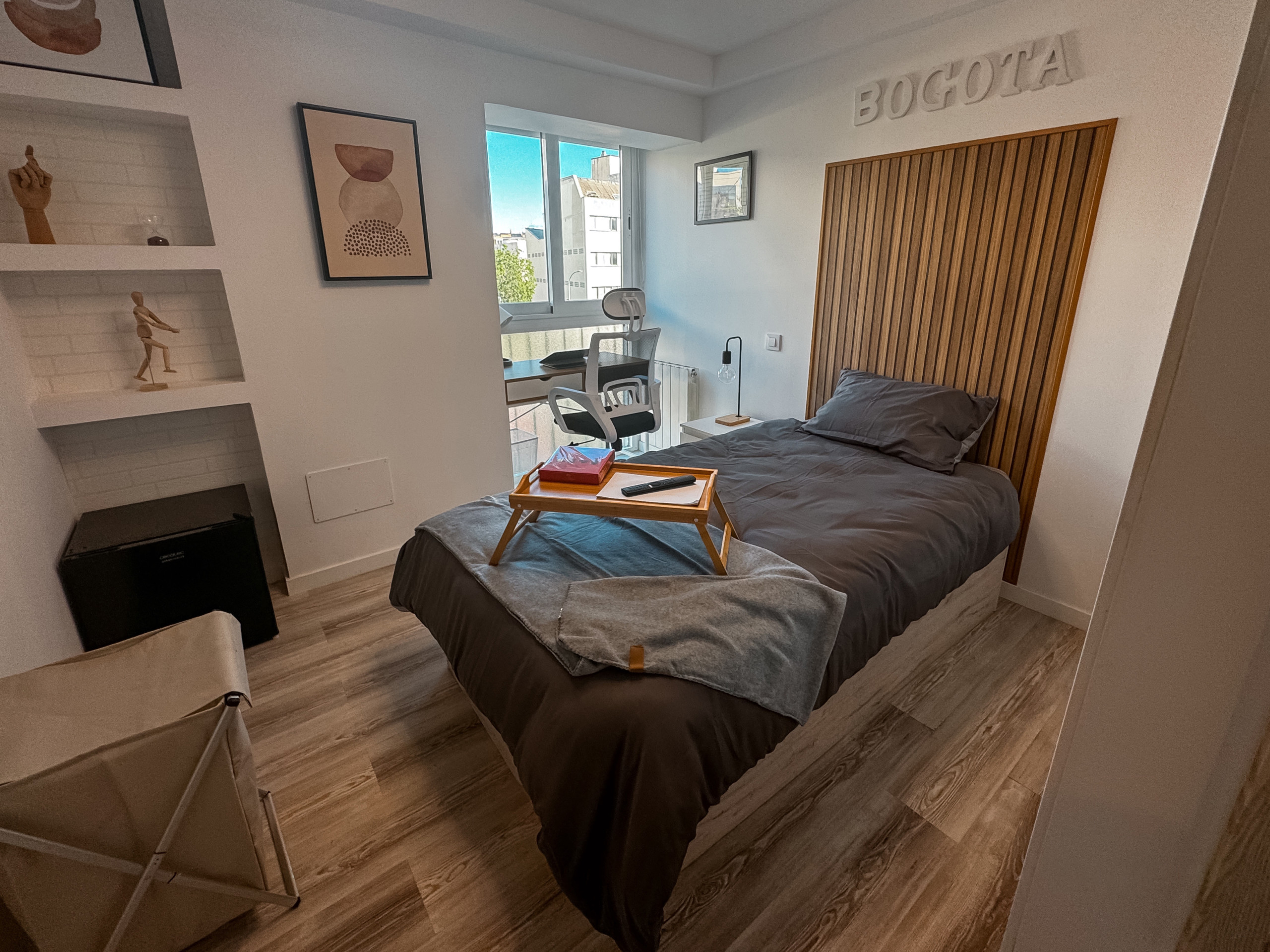 Room 1 - Bogotá: Single room. Located first upon entering the dwelling, it has all amenities, from the bed with a premium mattress, storage bed base, desk + chair, to smart TV, air conditioning, safe, iron + ironing board, wireless charger, smart lock, 2 sets of towels and sheets.