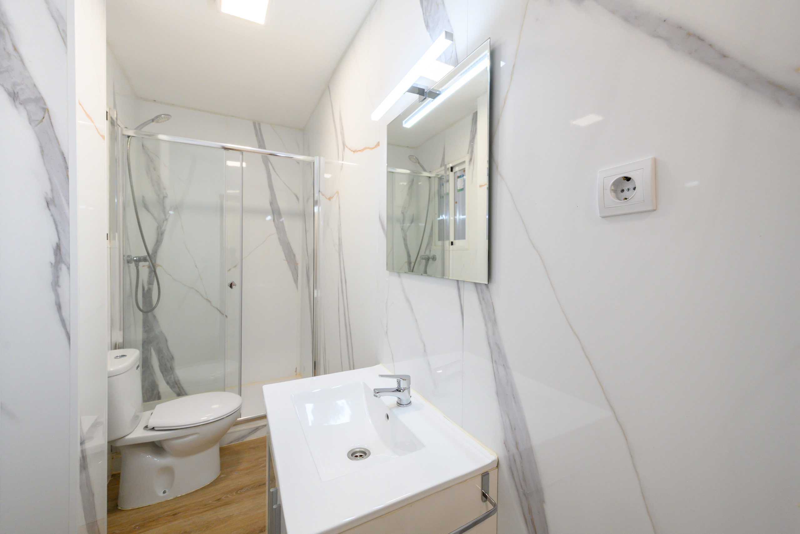 - Complete bathroom with WC, shower, mirror and space to store household items.
