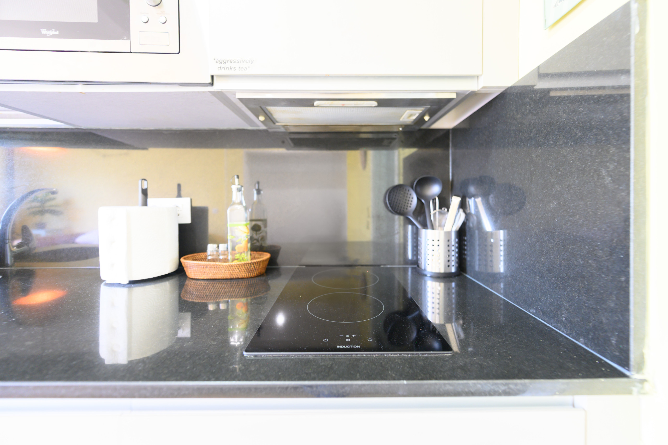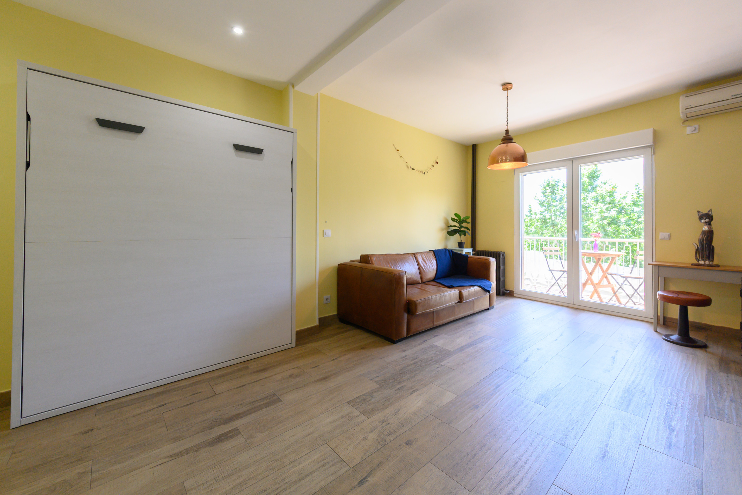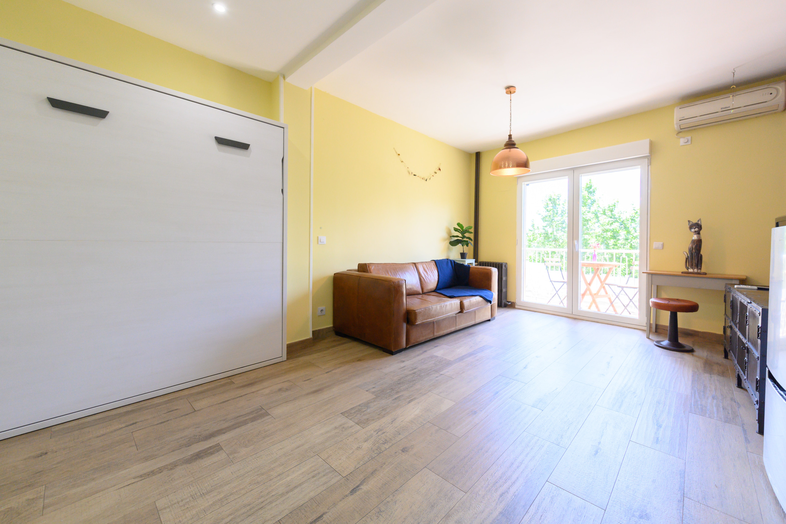 Located on the fourth floor of a building with a lift and physical doorman, this bright apartment offers a terrace and a balcony from which to contemplate the sunset in silence, without noise or traffic. Its interior, cosy and functional, is fully equipped: fold-down bed, Italian sofa bed, central air conditioning and a carefully designed decor that invites you to stay.
