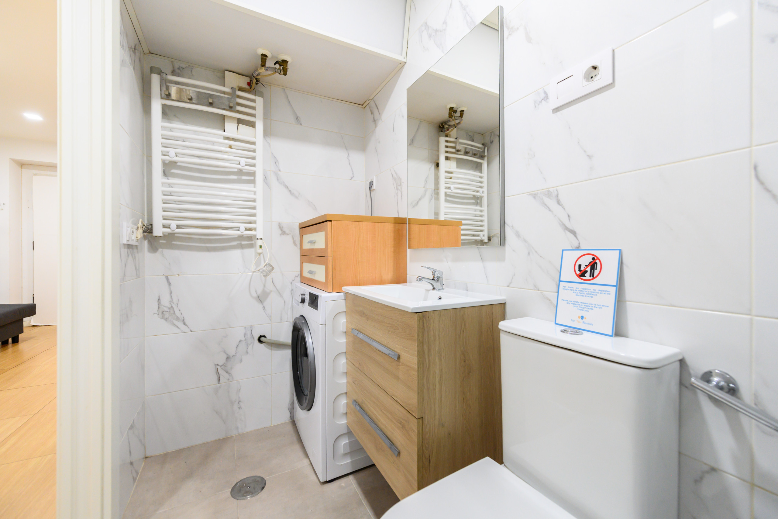 • Living area: double bed, wardrobe, clothes rack, chest of drawers, sofa that converts into a double sofa bed, air conditioning, heating, dining table, TV, and extra storage space. Fully equipped kitchen: refrigerator, microwave, dishwasher, storage space, and kitchen utensils. Full bathroom: toilet, shower, mirror, storage space, and washing machine.