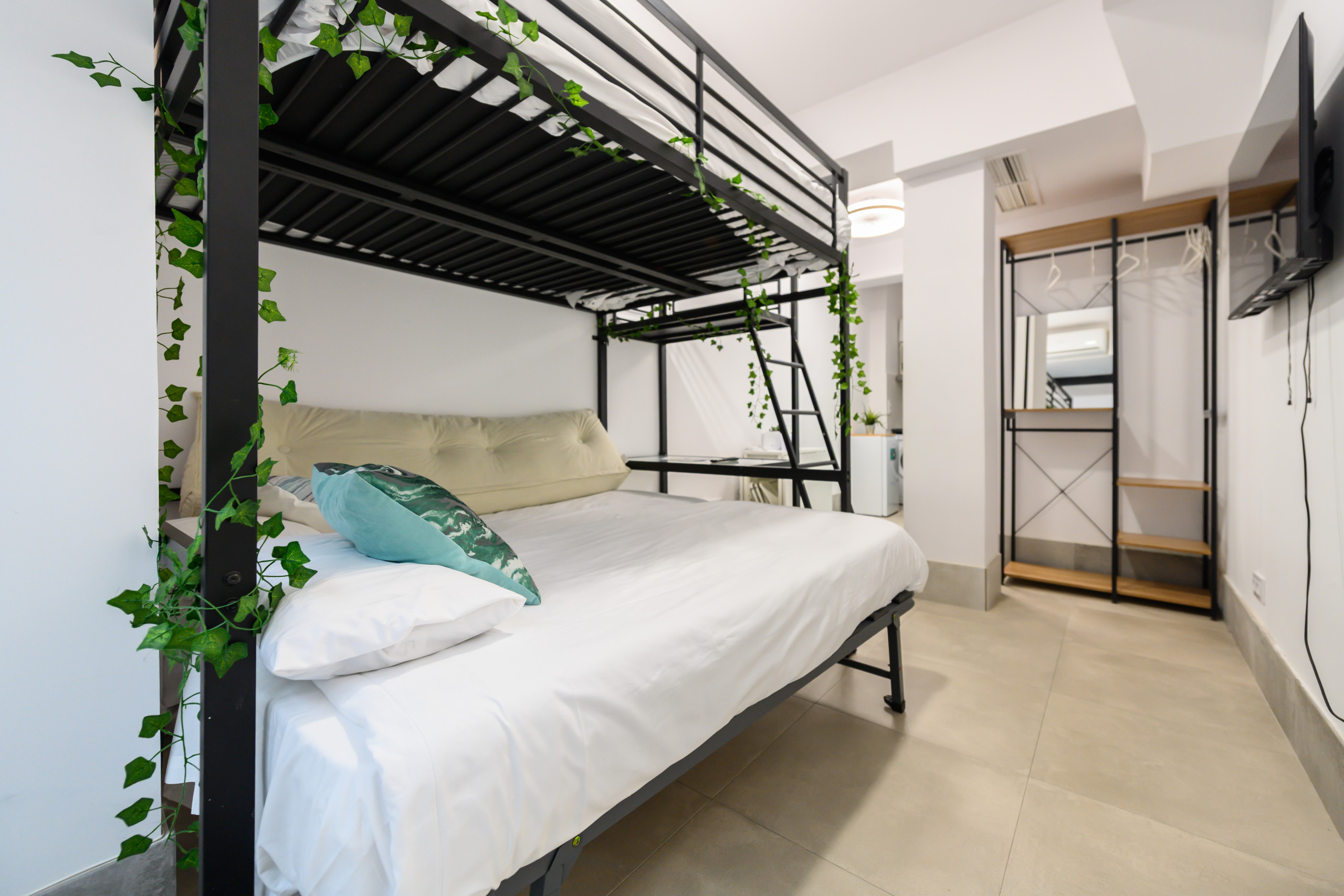 • Bunk bed with two single beds on the bottom and a double bed on top, table, television, mirror, and clothes rack. Full bathroom with toilet, shower, mirror, and storage space. Kitchen equipped with microwave, washing machine, refrigerator, and kitchenware. Heating and air conditioning to ensure comfort year-round.